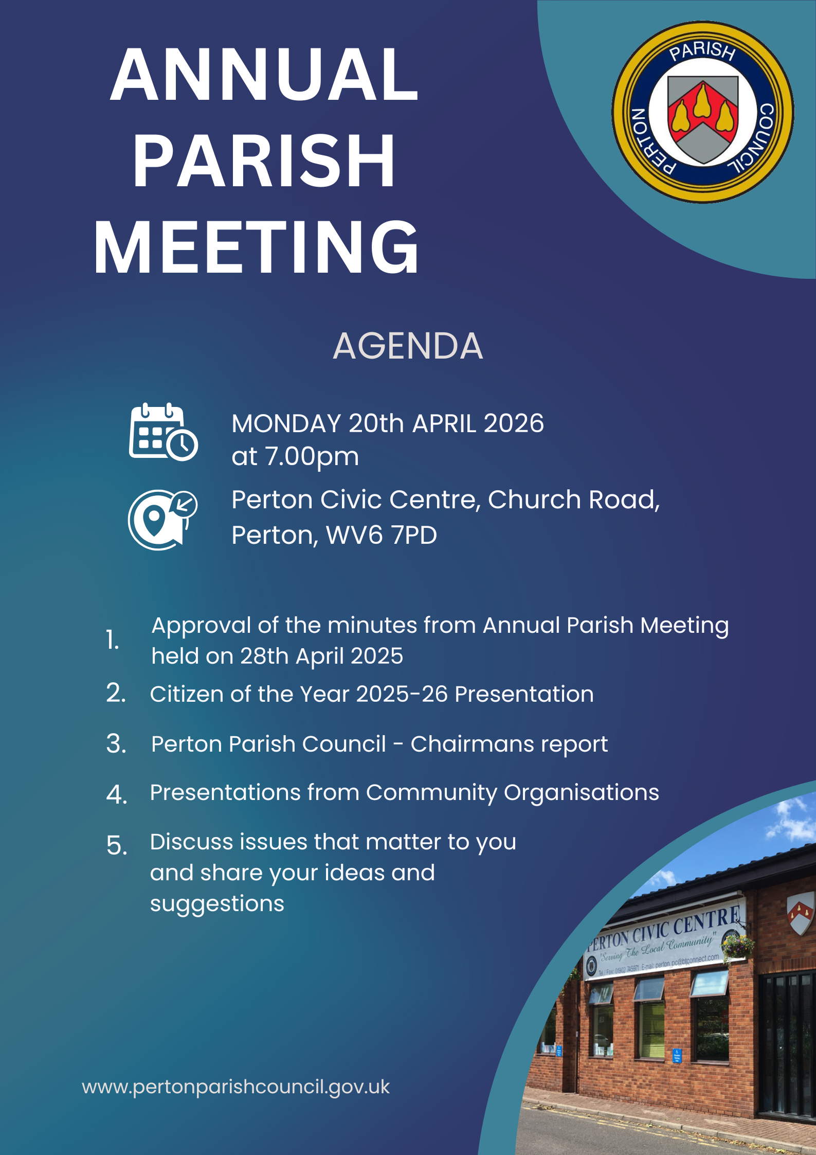 Meetings held in Perton Civic Centre at 7.00pm with public forum (unless otherwise specified).